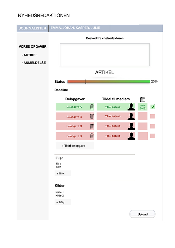 The editors is a digital tool for spiljournalist.dk that aims to include all group members of a specific student project (concerning a specific game), provide the opportunity for progression, and create an overview of the whole writing process. This by letting each student choose a sub-task from the overall given by the teacher (the chief editor), set a deadline for the subtask, and check it off when done. The status of completion (of the overall task) is visible at the top of the screen by a coloured status bar so that the students will always be aware of the amount of work they have left. In the long term, the tool should be able to make the students organise their work process by themselves.